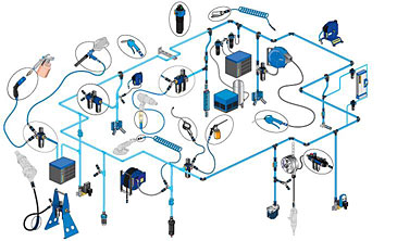 Tuyaux techniques spécifiques et tubes rigides permettent le montage d'un réseau d'air comprimé.